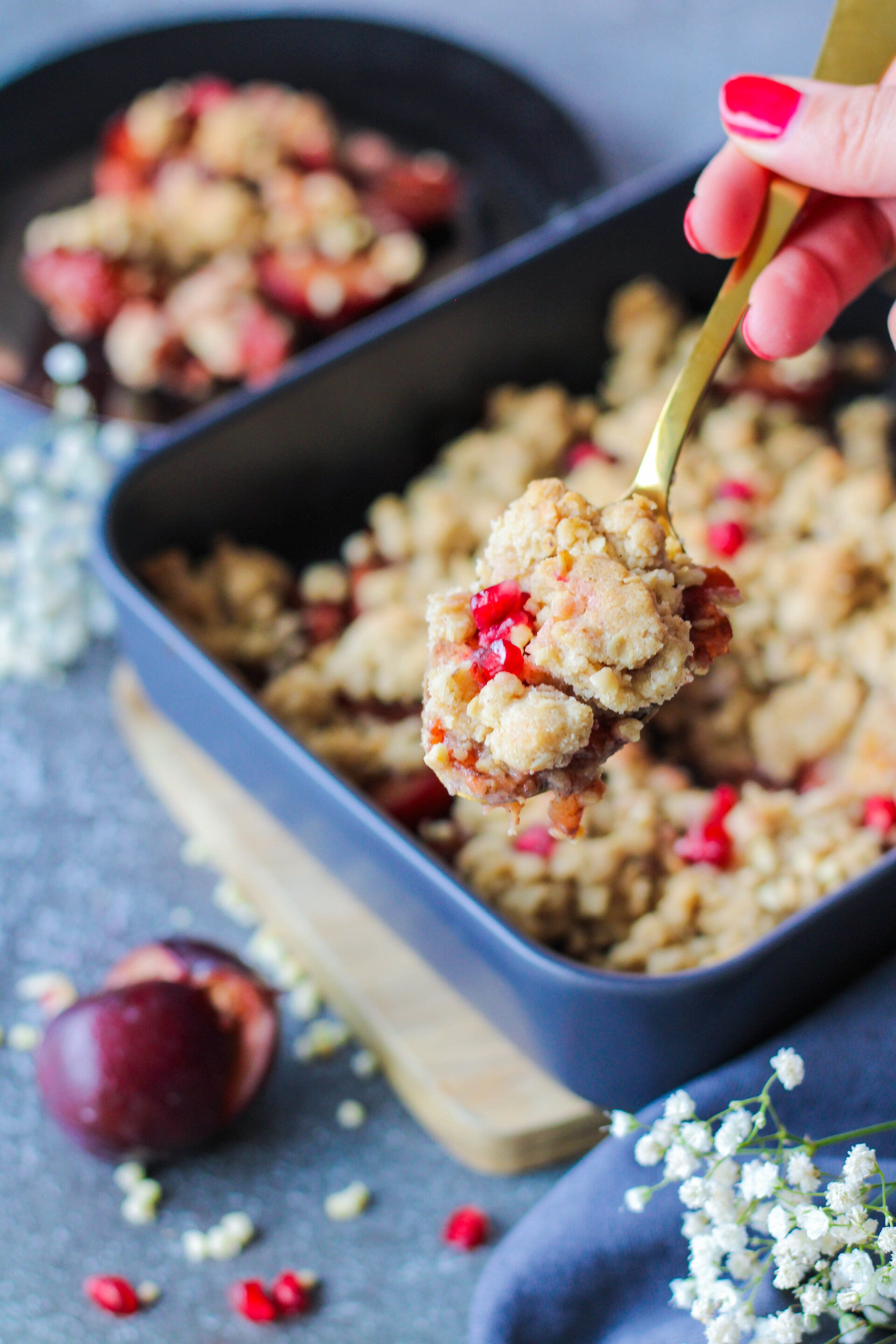 Aus dem Ofen nehmen und warm mit frischen Granatapfelkernen servieren.