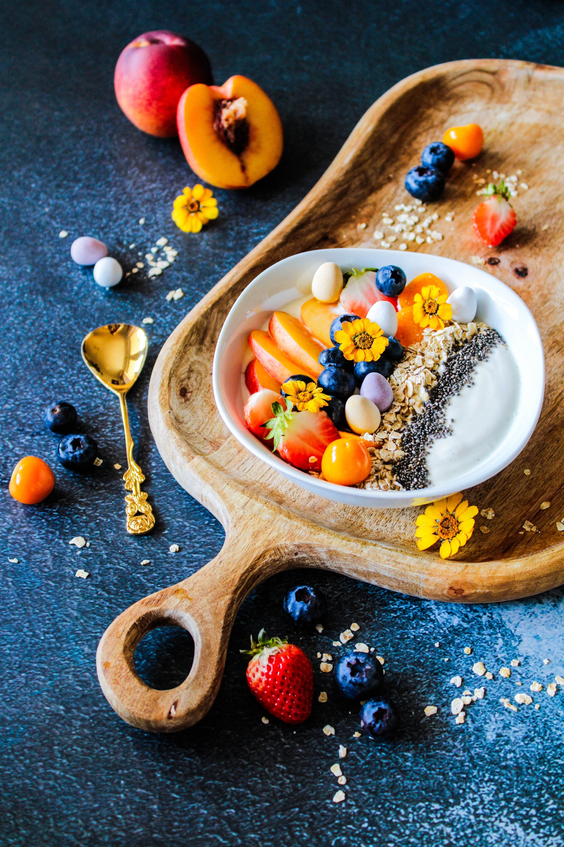 Bowl mit Obst, Schokoeiern und essbaren Blüten nach Belieben anrichten und dekorieren.